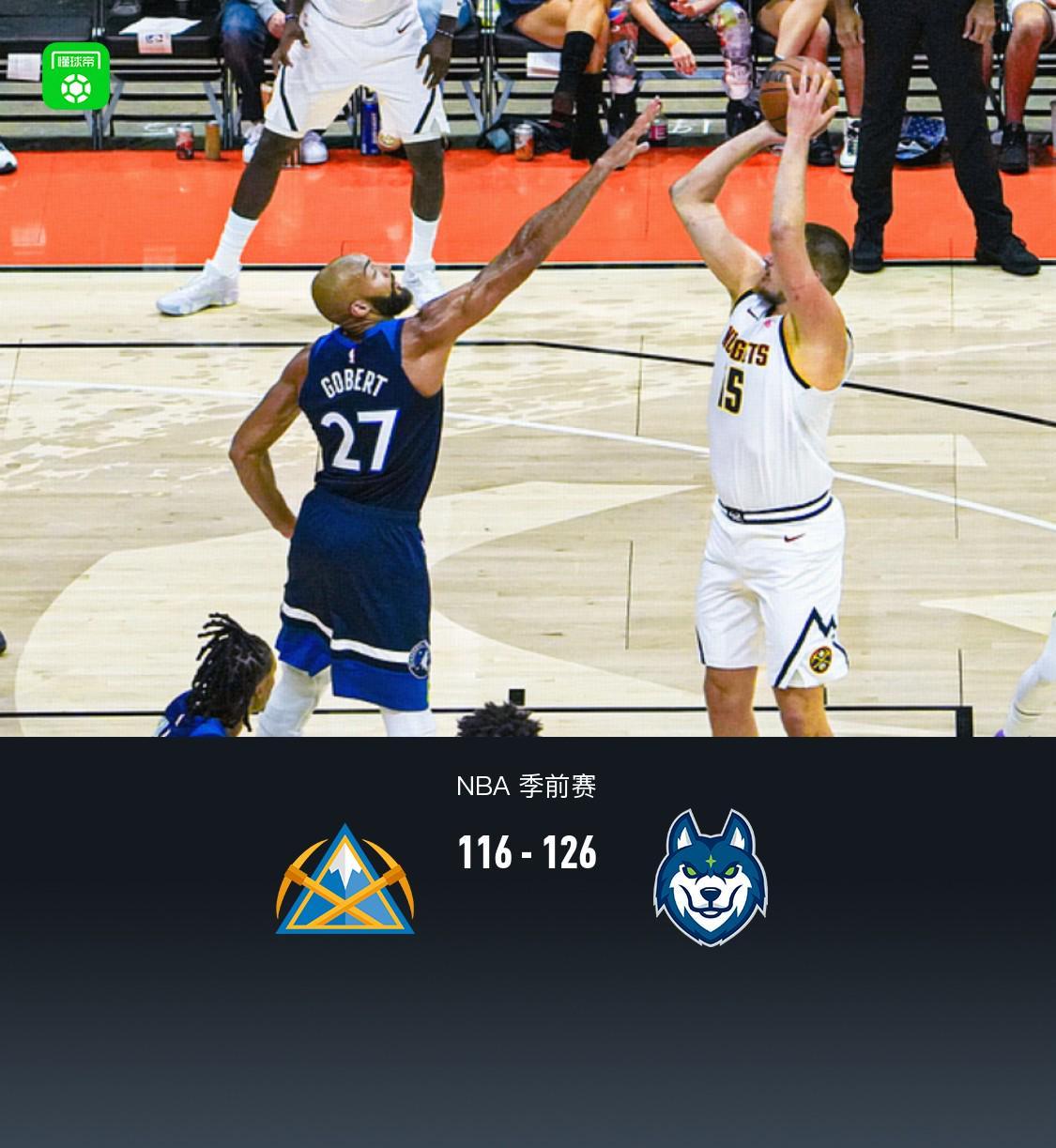北京時間10月5日NBA 季前賽,丹佛掘金對陣明尼蘇達森林狼。半場掘金63-72森林狼,最終掘金116-126森林狼。