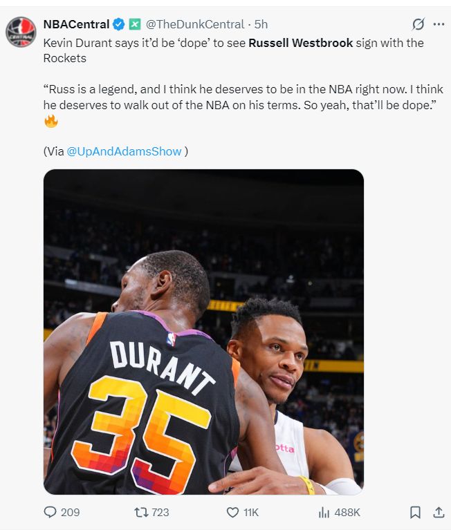 北京時(shí)間10月9日,火箭球星凱文-杜蘭特在接受UpAndAdamsShow訪問時(shí)談到瞭關(guān)於拉塞爾-威斯佈魯克與火箭的流言情況,KD表態(tài)願(yuàn)意跟威少