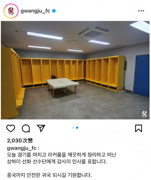 光州FC感謝申花清理更衣室並祝福球隊(duì)平安返程