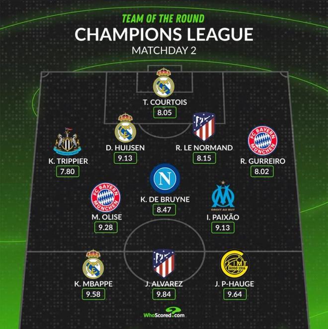 姆巴佩領(lǐng)銜!歐冠第二輪最佳陣容,凱恩落選,德布勞內(nèi)在列