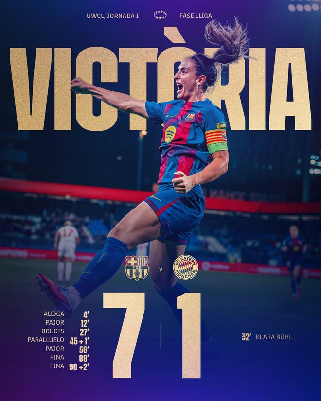 全場比賽由普特拉斯在第4分鐘首開紀(jì)錄,皮娜和帕約爾雙雙梅開二度,巴薩女足五人建功打入七球大勝拜仁女足。