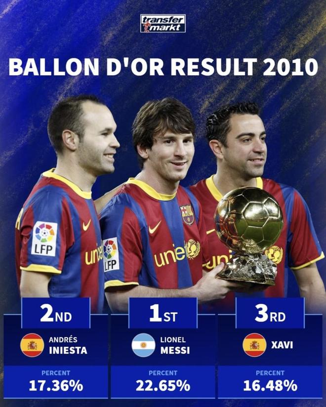這是金球獎(jiǎng)與世界足球先生合并后的首屆 FIFA 金球獎(jiǎng)。投票人由國(guó)家隊(duì)主帥、國(guó)家隊(duì)隊(duì)長(zhǎng)、記者三方組成。那一年剛好是世界杯年,而且俱樂(lè)部層面出現(xiàn)了穆里尼奧的國(guó)米“三冠王”;國(guó)家隊(duì)層面是西班牙奪得隊(duì)史首個(gè)世界杯。最終入圍前三的是梅西、伊涅斯塔、哈維,斯內(nèi)德排第4——這也成了多年?duì)幾h的起點(diǎn)。