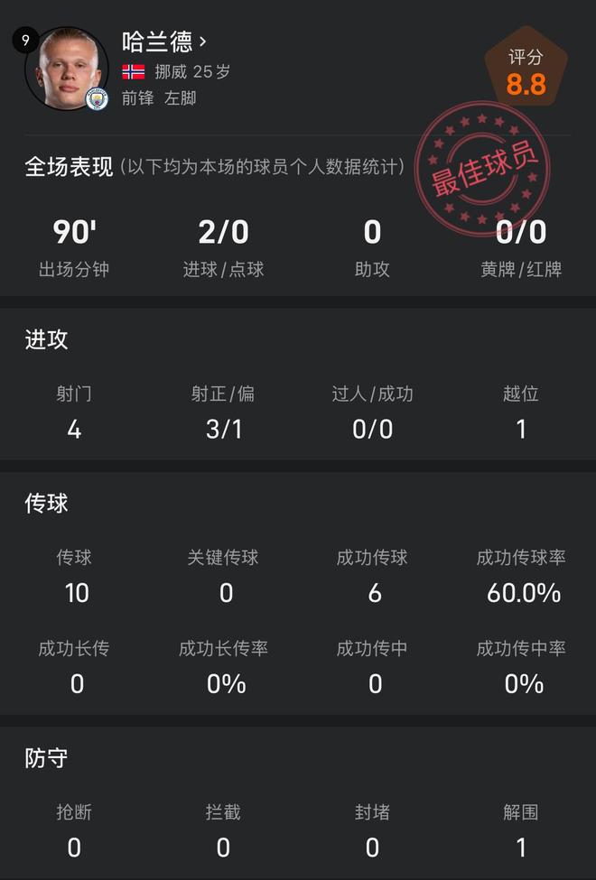 哈蘭德對陣摩納哥數(shù)據(jù):射正3次,打入2球