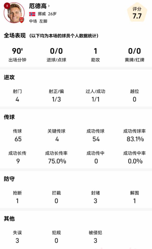 厄德高本場比賽貢獻(xiàn)4次射門,1次成功過人;65次傳球。4次關(guān)鍵傳球,1次助攻,傳球成功率83.1%。防守方面還貢獻(xiàn)了1次搶斷3次封堵和1次解圍。