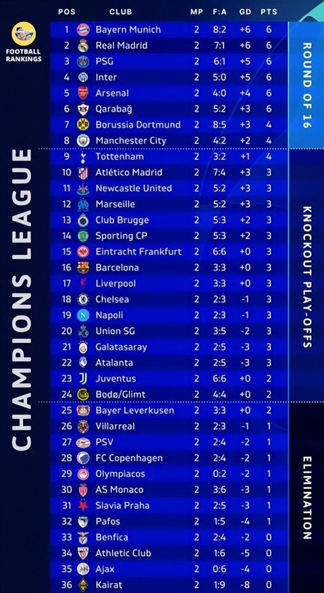 第2輪過后,25-26賽季歐冠聯(lián)賽階段積分榜更新,拜仁、皇馬、巴黎、國米、阿森納、卡拉巴赫同積6分位列前6,隨后是積4分的多特、曼城和熱刺!