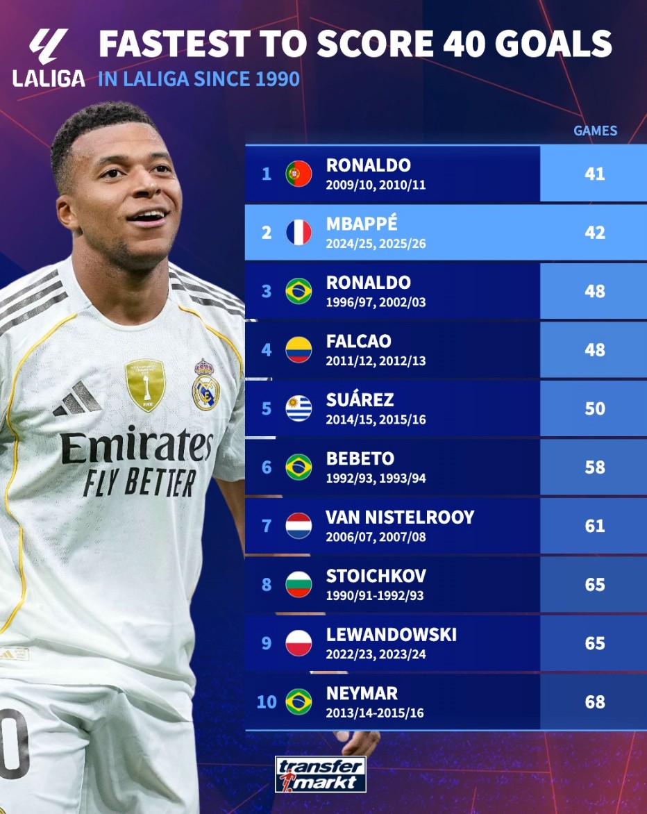 姆巴佩是90年以來僅次于C羅第二快達成西甲40球的球員 -