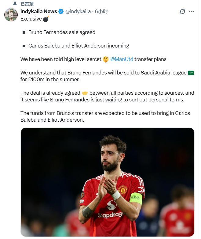 來自indykaila News的獨(dú)傢消息透露,曼聯(lián)已經(jīng)和沙特聯(lián)賽的球隊(duì)達(dá)成協(xié)議,以1億英鎊的價(jià)格出售曼聯(lián)隊(duì)長(zhǎng)佈魯諾費(fèi)爾南德斯,也就是B費(fèi),目前雙方已經(jīng)達(dá)成協(xié)議,B費(fèi)在等待個(gè)人條款的處理,曼聯(lián)將會(huì)把這筆轉(zhuǎn)會(huì)費(fèi)投入到巴萊巴和埃利奧特的引援上。indykaila News也就是大傢俗稱的“綠帽哥”,是著名的轉(zhuǎn)會(huì)自媒體,在今年夏窗報(bào)道瞭維爾茨等人的轉(zhuǎn)會(huì)消息得到瞭不少認(rèn)可。